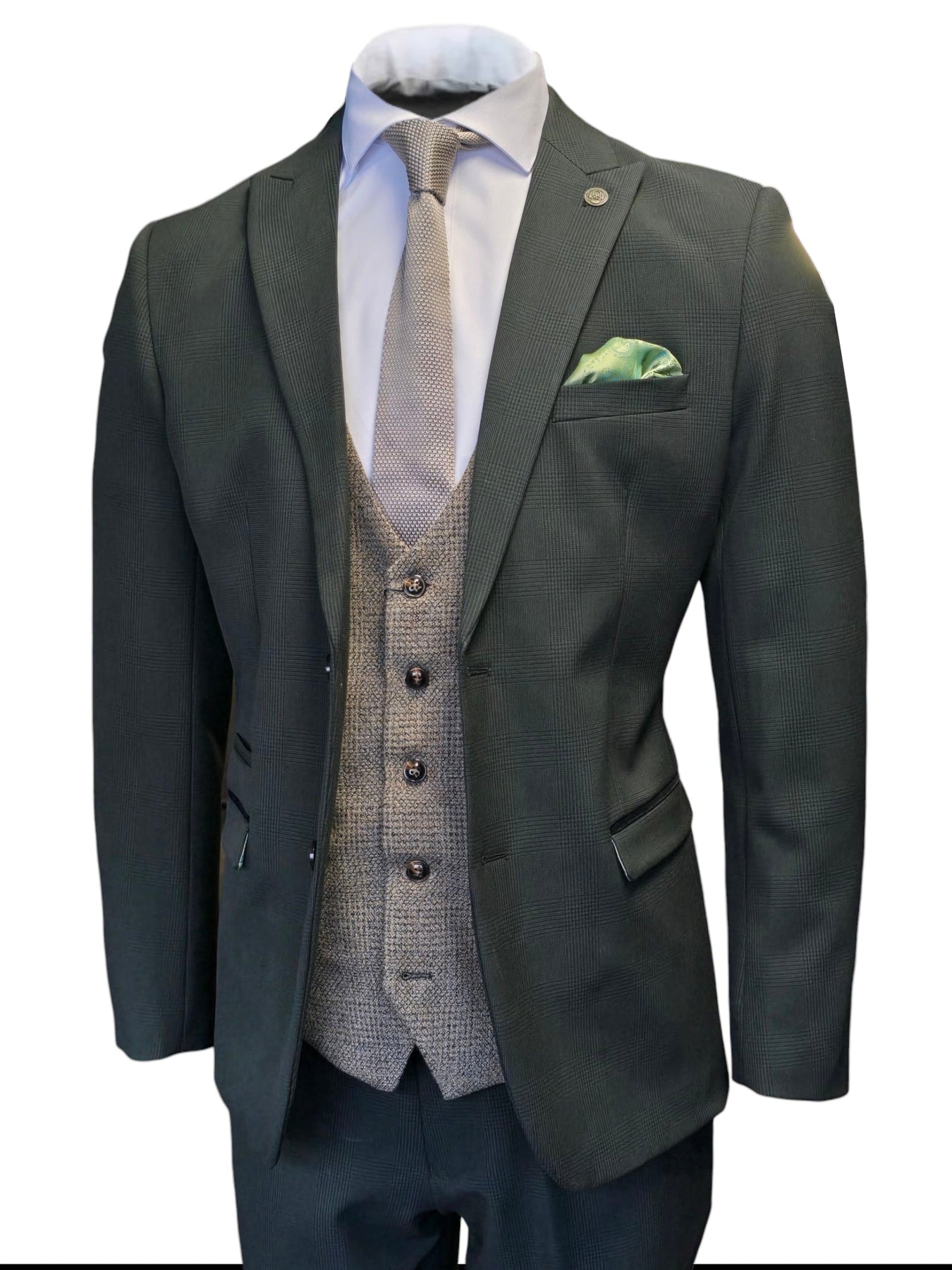 Der dreiteilige Anzug besteht aus einer Hose, einer Weste und einem Sakko – ideal also für alle Jahreszeiten. Sowohl das Innen- als auch das Außendesign überzeugen durch eine hochwertige Verarbeitung und geschmackvolle Akzente. Zum Anzug gehört ein hellgrünes Einstecktuch, das sich ganz nach Belieben durch andere Modelle austauschen lässt. Der Stoff besticht durch einen wunderschönen Grünton mit dezentem Karomuster. Die Taschen sind mit dunkelgrünen Besätzen versehen, und die Knöpfe wurden perfekt farblich abgestimmt. Das Innenfutter des Sakkos sowie die Rückseite der Weste sind mit einem farbenfrohen, stilvollen Futter versehen, das dem Look eine exklusive Note verleiht.