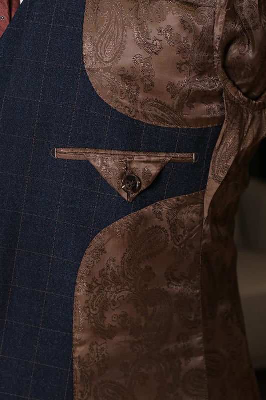 Im Inneren erwartet Sie ein auffälliges Innenfutter: ein Stück verborgener Reichtum, ein Design, das nur Sie kennen – wie der geheime Safe in einem antiken Wandschrank. Der Kontrast zwischen dem strengen, navyfarbenen Äußeren und dem verspielten Innenleben macht diesen Anzug einzigartig – eine Kombination aus Eleganz und Bravour.