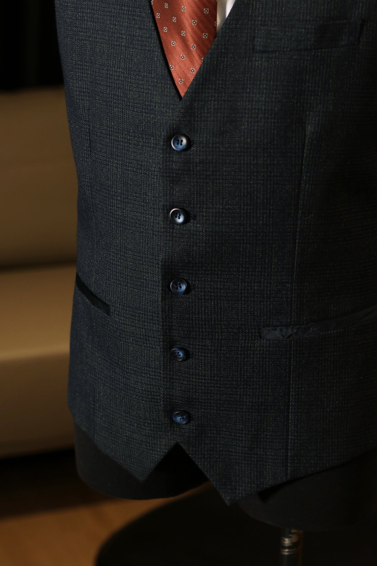 Liebe zum Detail Es sind die Details, die diesen Anzug von der Masse abheben. Achte auf die subtile blaue Naht an der Reverskante (dem Knopfloch), die luxuriösen passenden Knöpfe und den perfekt geschnittenen Westen-Schnitt. Ob du das Sakko offen für einen lässigen Look trägst oder geschlossen für ein schlankes Silhouett – die Passform sitzt in beiden Fällen makellos.